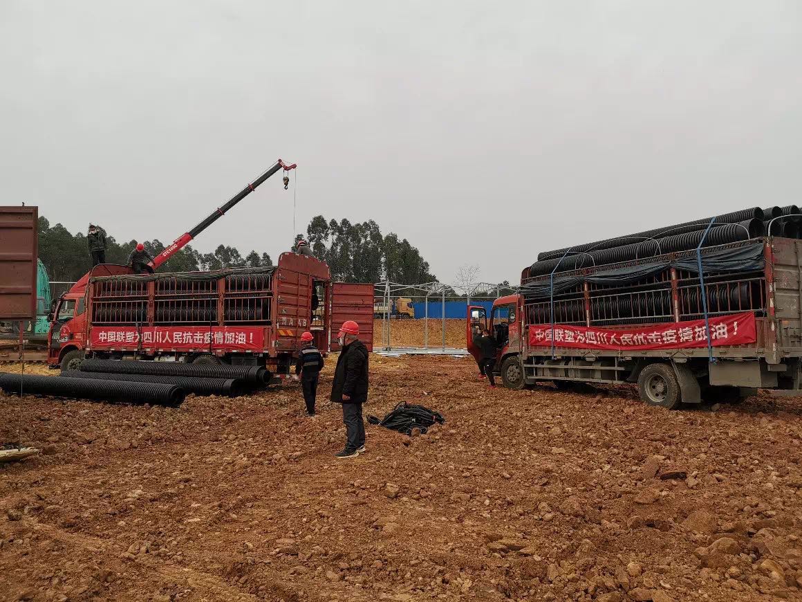 疫情當前,全力馳援。2月8日,中國聯塑收到關于南充市應急隔離醫院項目管材管件的需求后,應急專項小組緊急協調四川聯塑人員、物資、倉儲、物流等資源,與當地的紅十字會機構進行多方面溝通協調。當晚以晝夜不休的態度將管材管件準備好,調度運輸車輛,安排車輛進場,讓捐贈的管材管件組織、交接工作快速而有條不紊地進行,確保項目建設所需的給排水管材管件能以最快的速度運到現場。經過連夜的奮戰準備,聯塑集團向南充市應急醫院建設項目捐贈的HDPE雙壁波紋管、PE管等管材管件在2月9日通過近十輛大貨車,滿載四川聯塑捐贈的物資抵達施工現場,協助醫院盡快建成投入使用。